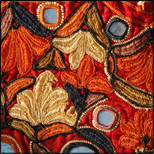 Rabari Rabari embroidery is unique to the nomadic Rabaris. Essential to Rabari embroidery is the use of mirrors in a variety of shapes. Rabaris outline patterns in chain stitch, then decorate them with a regular sequence of mirrors and accent stitches, in a regular sequence of colors. Rabaris also use decorative back stitching, called bakhiya, to decorate the seams of women's blouses and men's kediya/ jackets. The style, like Rabaris, is ever evolving, and in abstract motifs Rabari women depict their changing world. Contemporary bold mirrored stitching nearly replaced a repertoire of delicate stitches --which Kala Raksha revived. (for more information on Rabari embroidery see Frater, Judy, Threads of Identity: Embroidery and Adornment of the Nomadic Rabaris, Ahmedabad: Mapin, 1995.) |